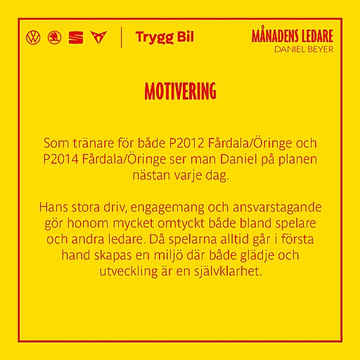 Varje månad under säsongen kommer vi att i samarbete med TryggBil utse "Månadens Ledare", ett sätt att uppmärksamma ett antal av alla våra fantastiska ledare som finns i föreningen. Vår huvudpartner TryggBil ordnar med pris till vinnaren!